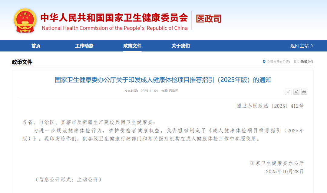 11月4日,國(guó)家衛(wèi)健委發(fā)布了《成人健康體檢項(xiàng)目推薦指引(2025年版)》,旨在為進(jìn)一步規(guī)范健康體檢行為,維護(hù)受檢者健康權(quán)益,促進(jìn)健康體檢事業(yè)發(fā)展。